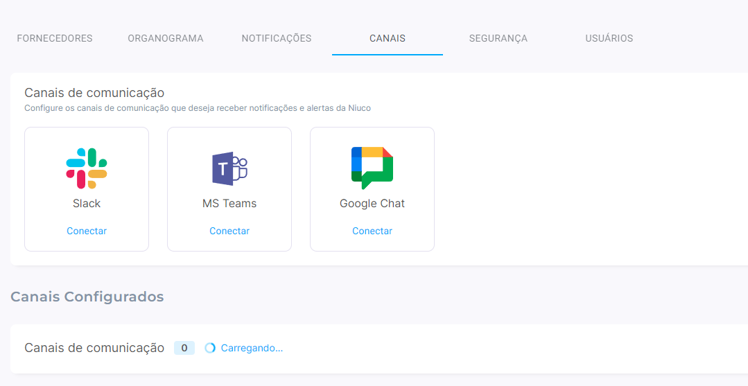 Na aba de Canais em Configurações: