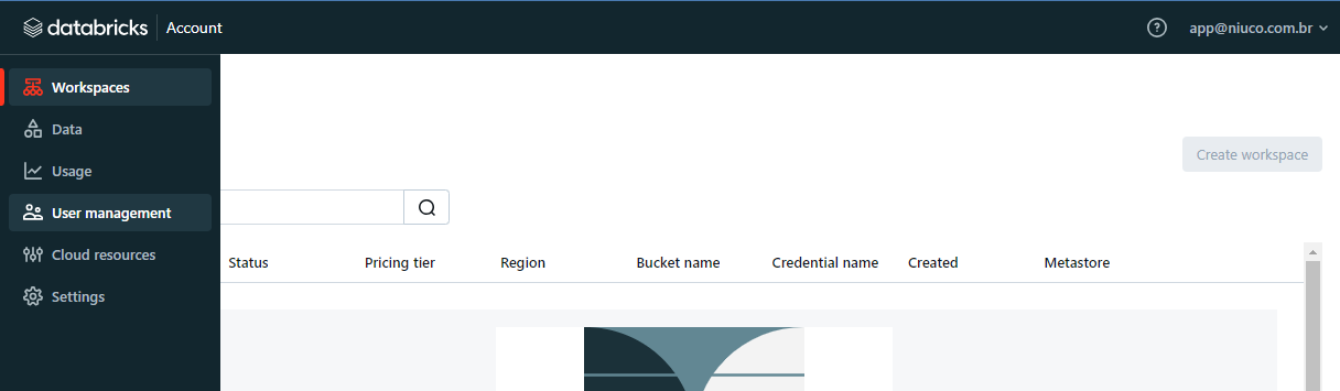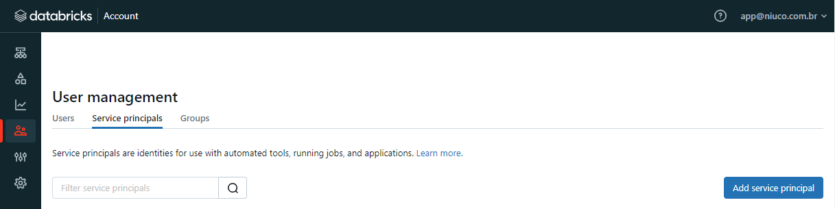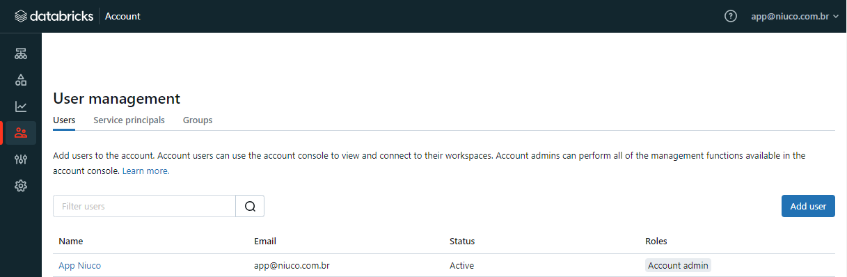 Faça o login em https://accounts.cloud.databricks.com, e no menu esquerdo, clique em User Management.