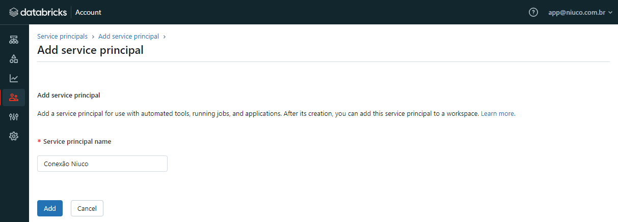 Defina um nome para ele no campo Service Principal Name e clique em Add: