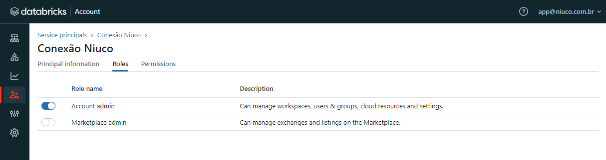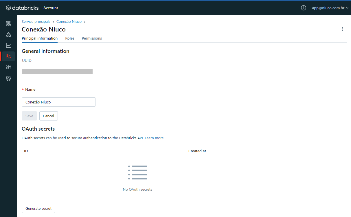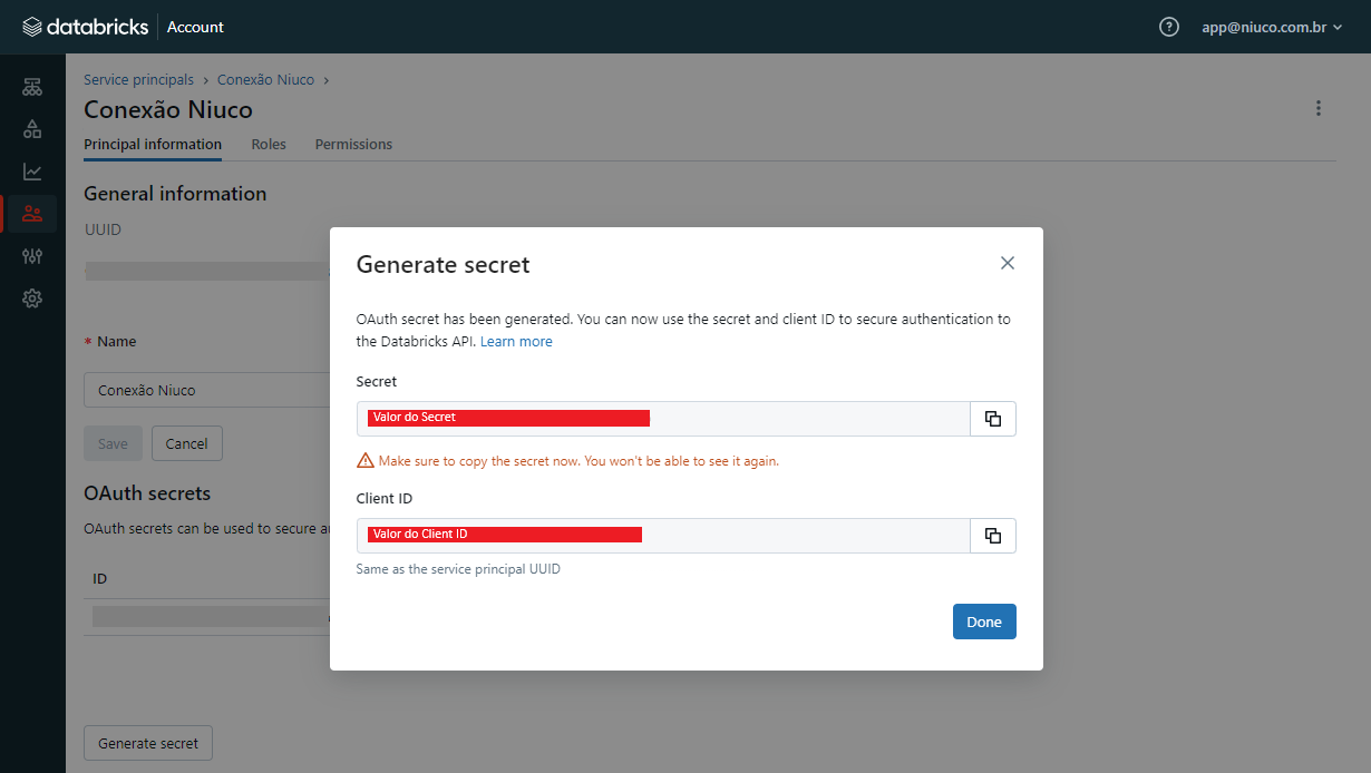 Agora você já tem o Client ID e o Secret do Service Principal, além de configurá-lo como Account Admin. Pode ir para o próximo passo.