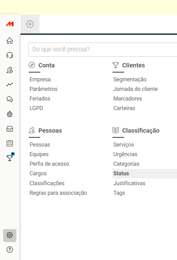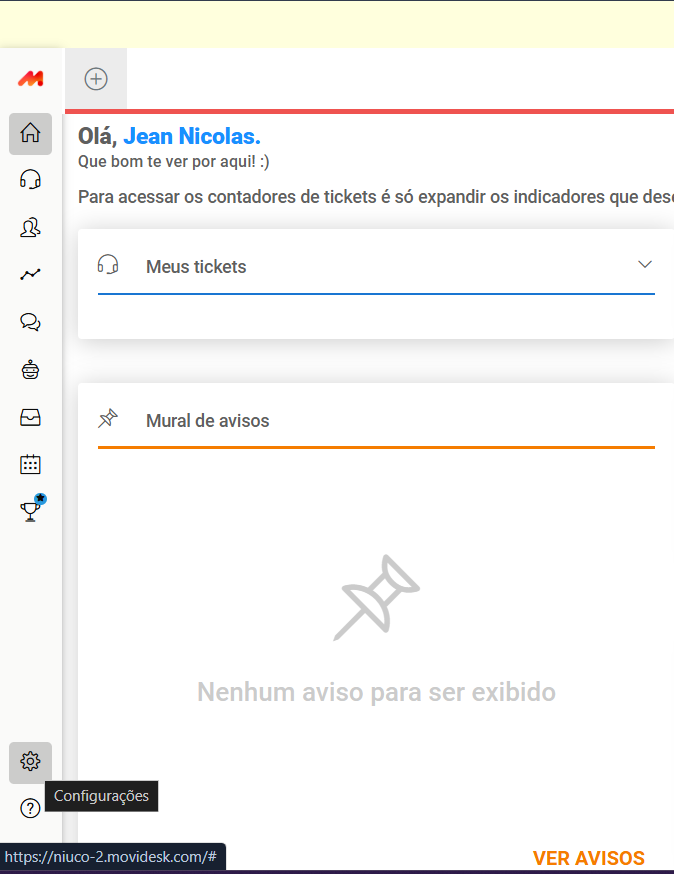 Faça o login em https://suaconta.movidesk.com/Account/Login, e clique em configurações que fica na parte inferior do menu esquerdo.