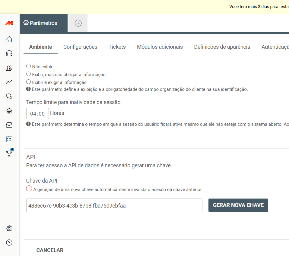 Logo após clicar em Parâmetros, vai abrir uma nova aba mostrando então diversas opções, nesta tela você precisa estar na aba Ambiente, role a tela até o final e vera uma agrupador API, onde tem a chave da api (Api Token), você pode copiar esta chave ou gerar uma nova.