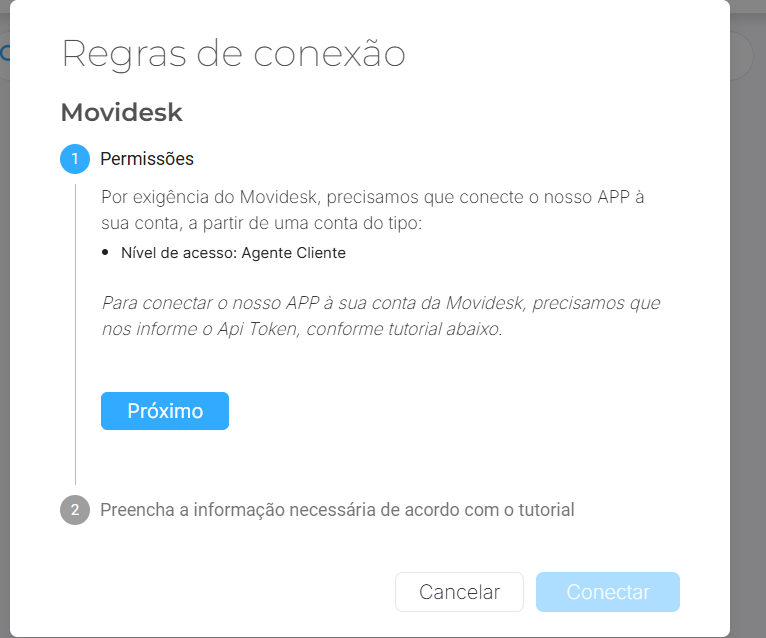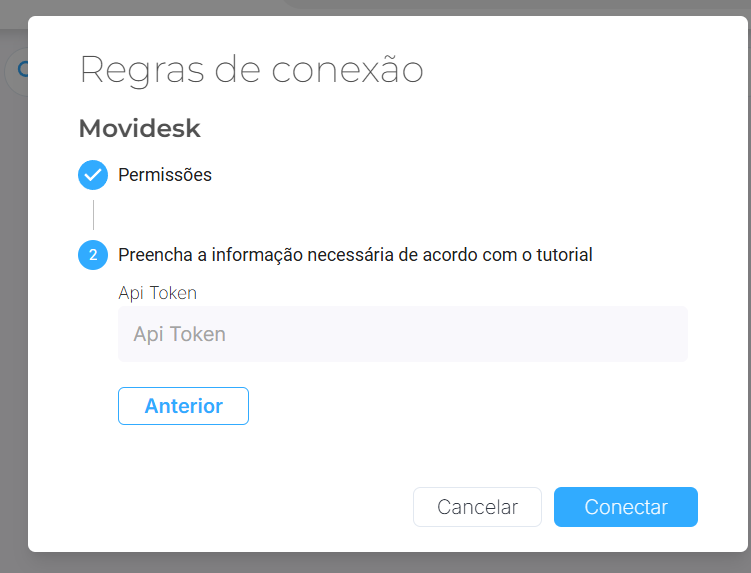 A conexão com o Movidesk é bem simples, só é necessário estar com a chave da api (Api Token):