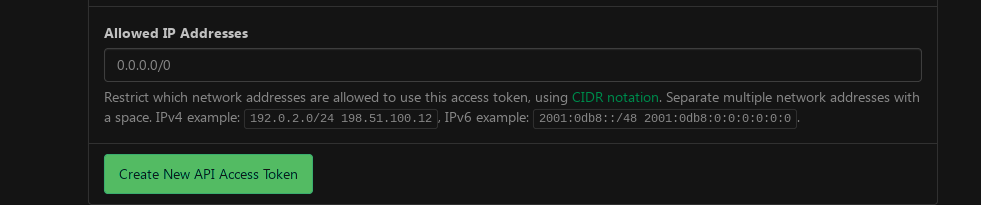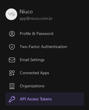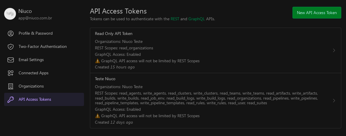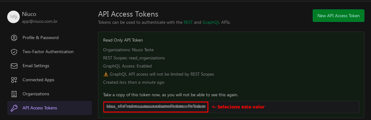 Com tudo configurado, pode clicar em Create New API Access Token:
