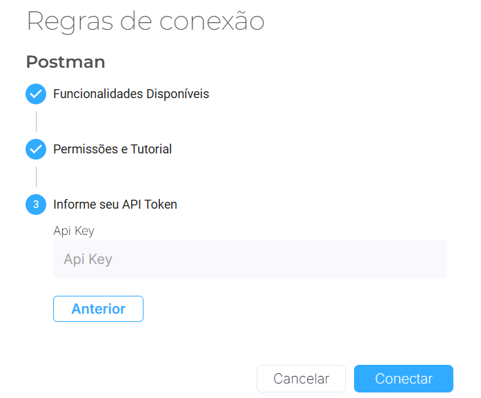 A conexão com o Postman é bem simples, só é necessário estar com a chave da api (Api Key):
