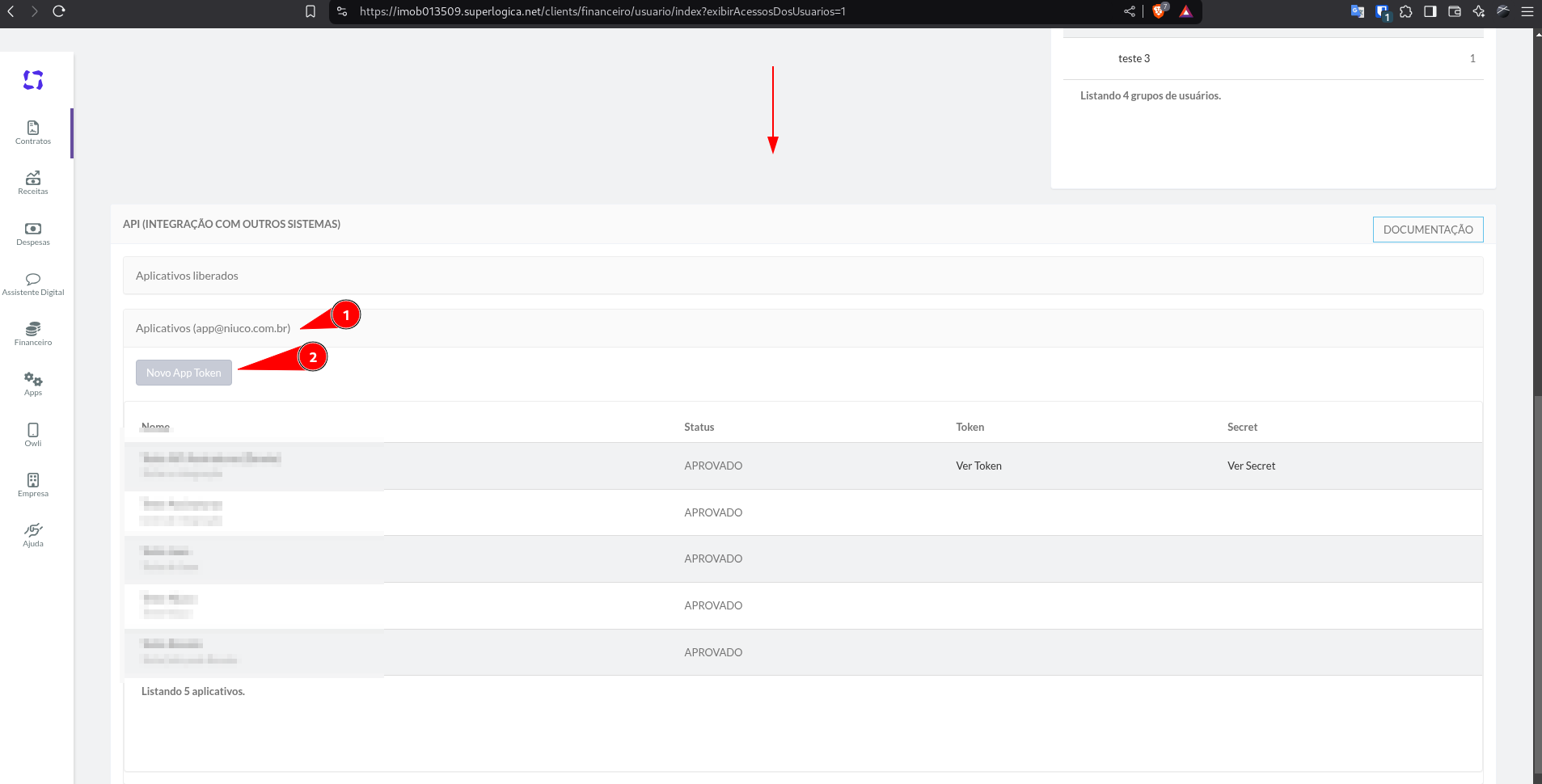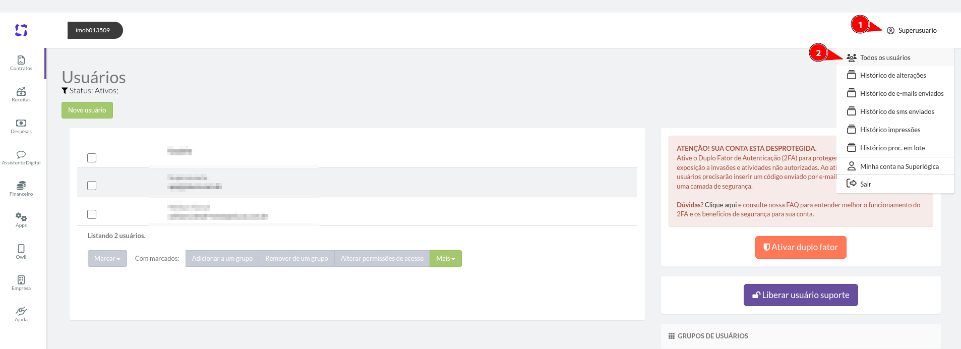 B1. Na parte de listagem de usuário (Se for acessar pelo link, precisa altera o {id} pelo número do seu modulo) https://imob{id}.superlogica.net/clients/financeiro/usuario/index?exibirAcessosDosUsuarios=1