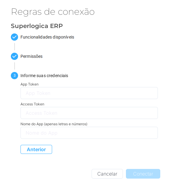 Coloque os dados de App Token, Access Token e Nome do App nos campos abaixo, e depois clique em Conectar: