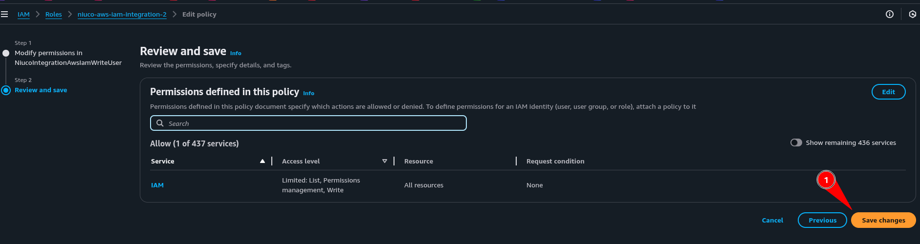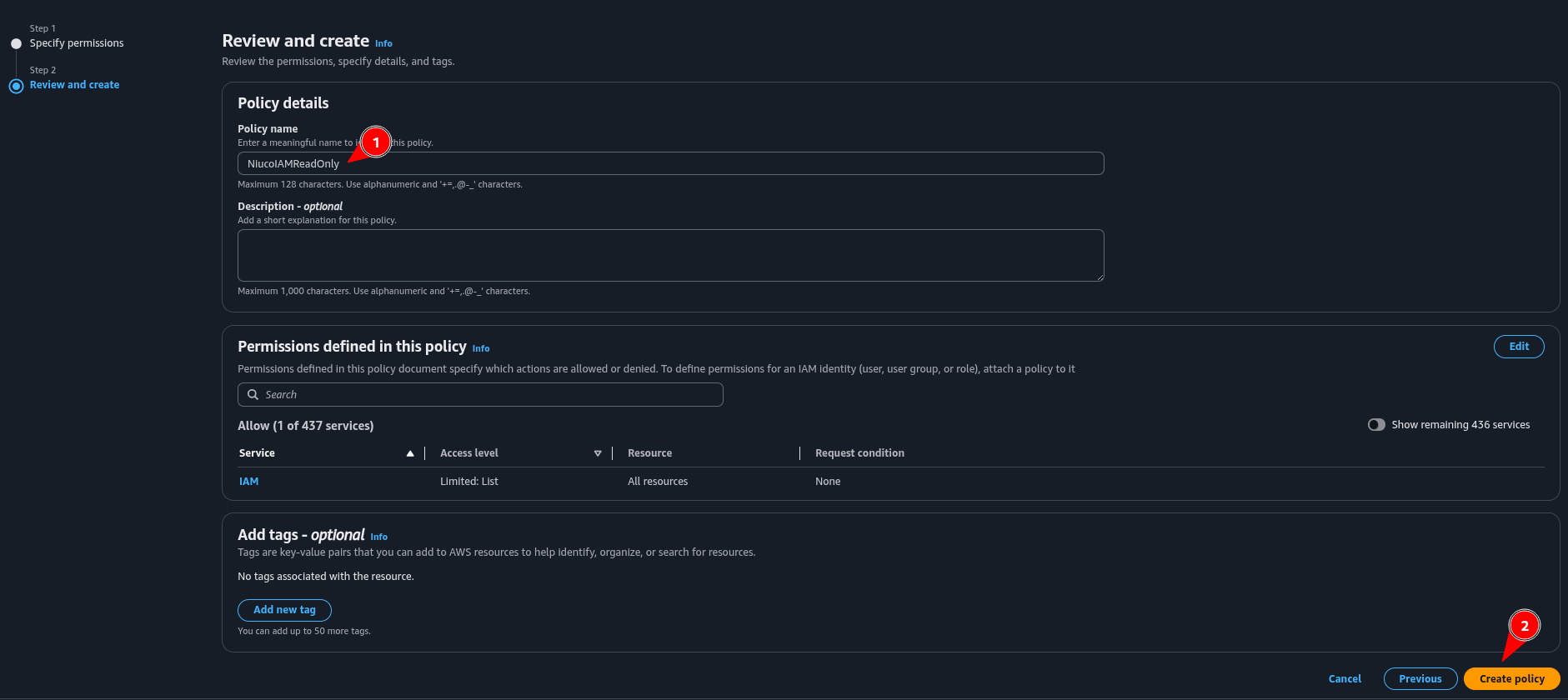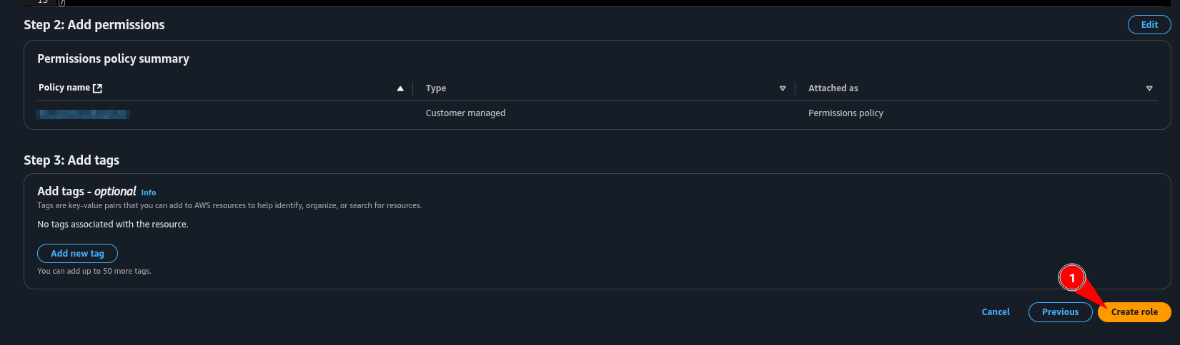 4. Digite um nome para role “NiucoIntegrationAwsIam”. Verifique se a política criada anteriormente está anexada à role e clique em Create role