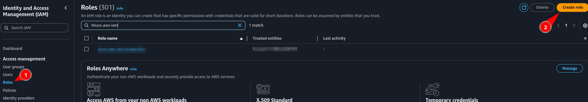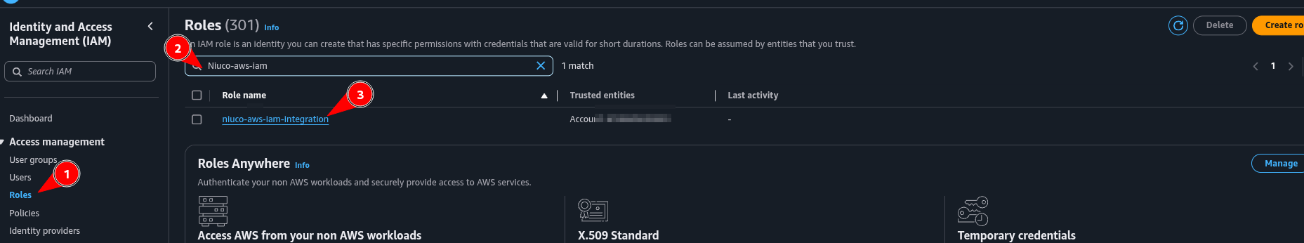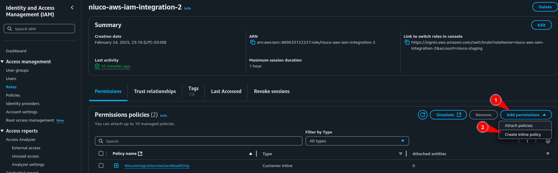 5. Na página de roles do IAM, clique na role recém criada “NiucoIntegrationAwsIam”