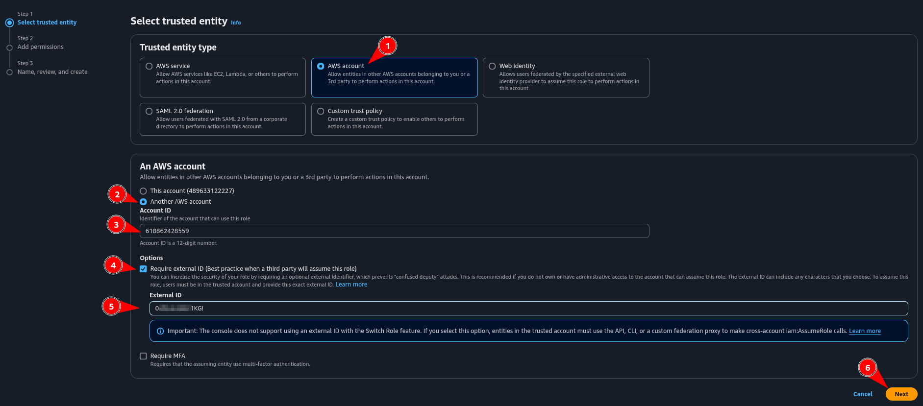 2. Selecione AWS Account, marque a opção "Another AWS account" informe o "Account ID" copiado da niuco, selecione a opção "Require external ID" e crie um "External Id". Após preencher estas informações, clique em "Next"