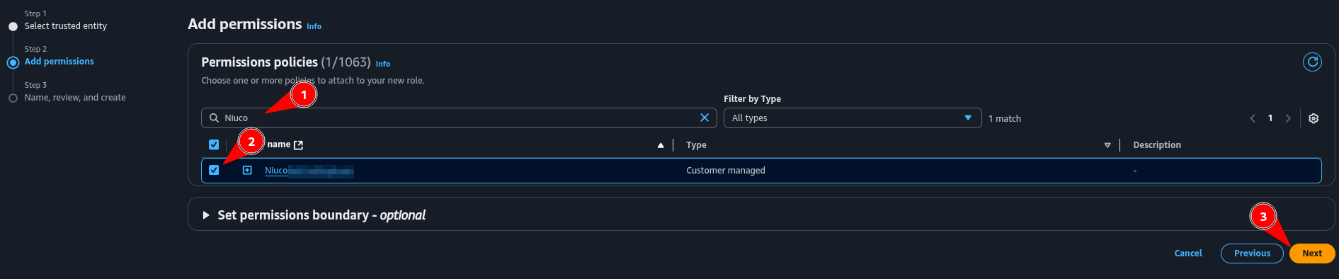 3. No campo de pesquisa, procure pela policy que criamos nas etapas anteriores (1 à 4) e selecione a policy e clique em "Next"