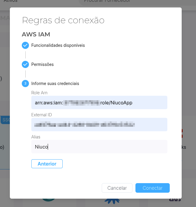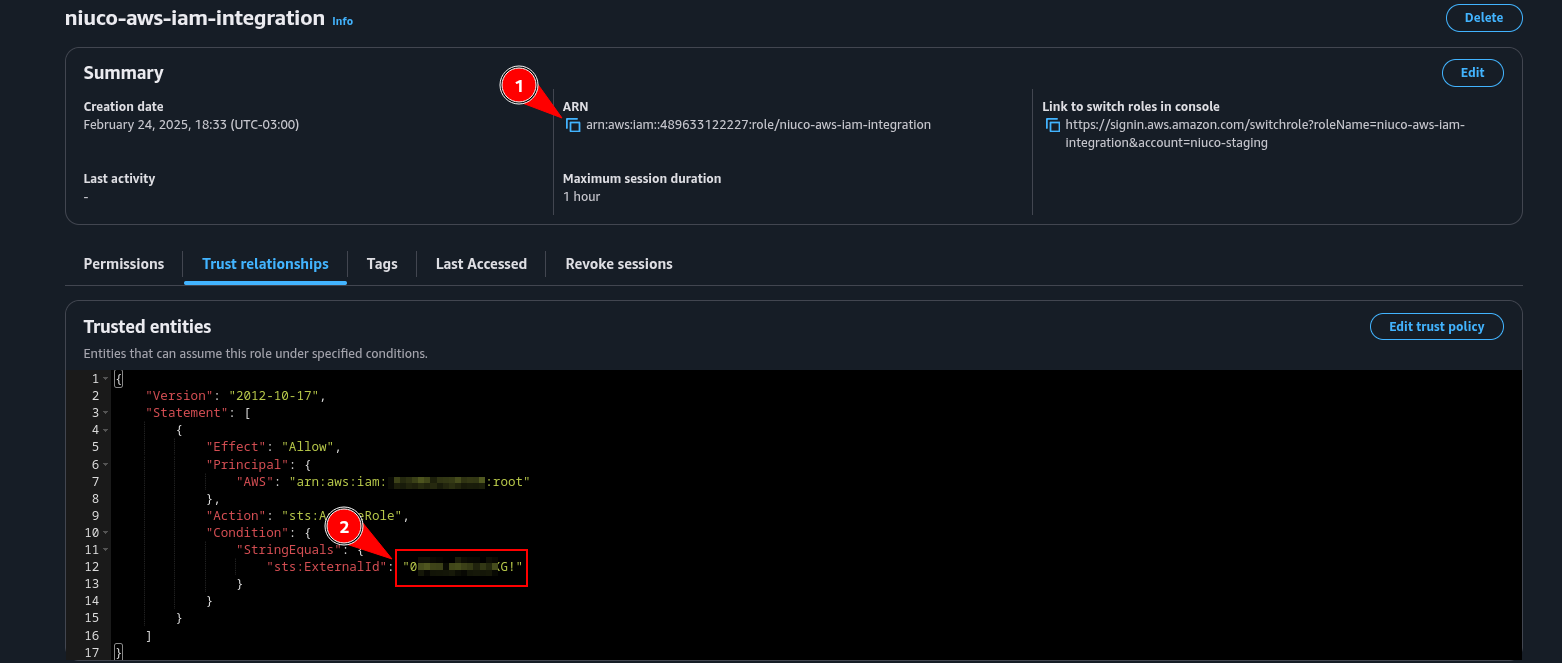 6. É possível visualizar a Role ARN e o External ID, essas chaves que deve ser compartilhada com a Niuco para finalizar a integração