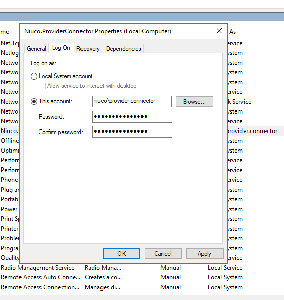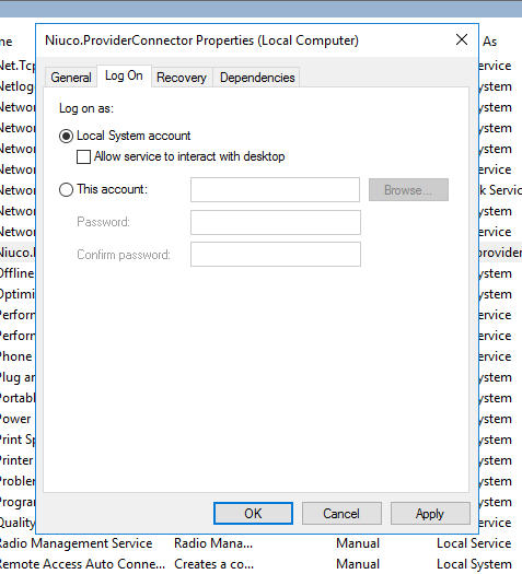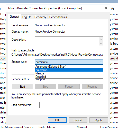 sc create Niuco.ProviderConnector binPath= "C:\caminho-completo\service\Niuco.ProviderConnector.Worker.exe"