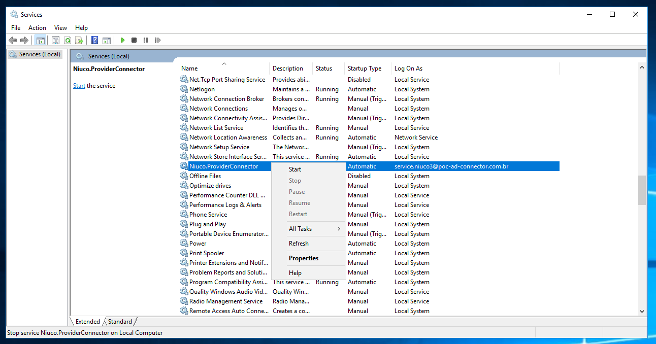 - Clique com o botão direito acima do serviço do conector e selecione a opção Start
