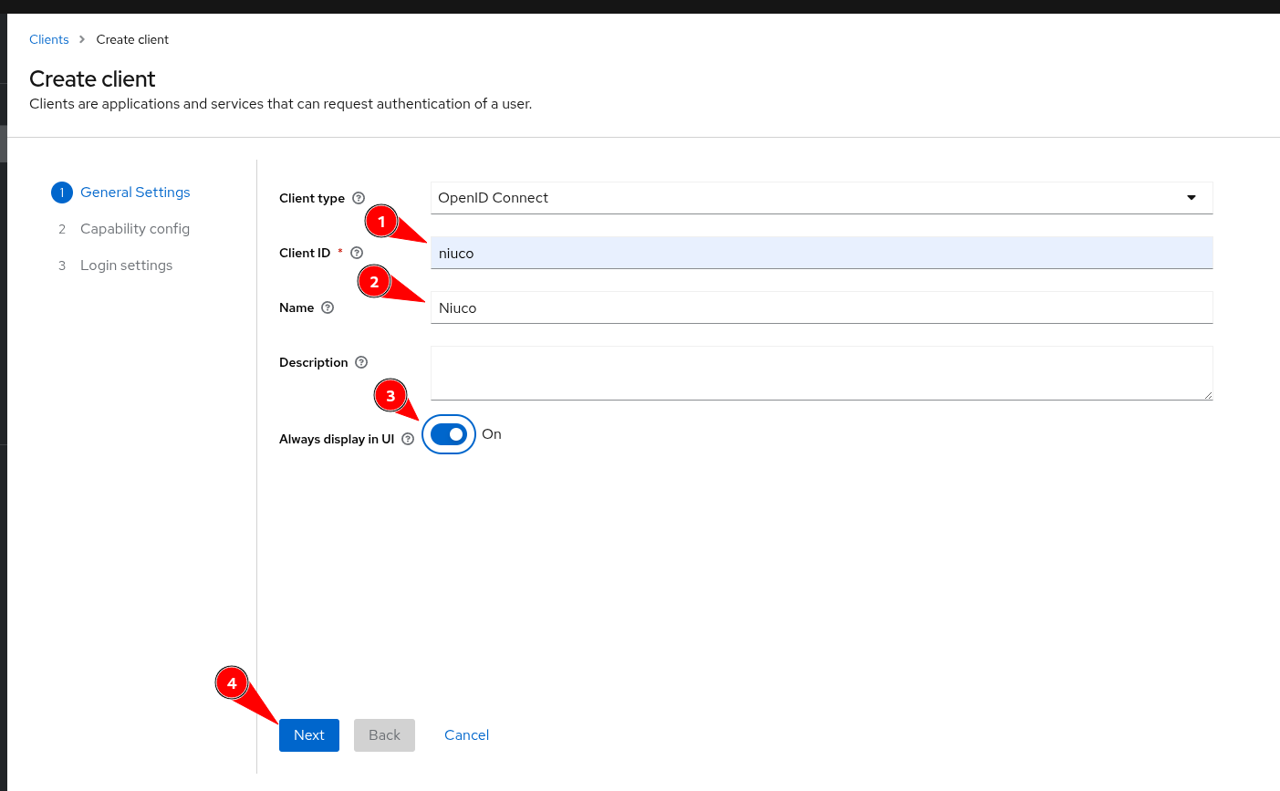 2 - Na tela que abriu, você deve preencher o campo "Client ID" com o nome do client, sugerimos que informe "niuco" e no campo "Name" coloque um nome para identificar de forma fácil a utilidade desse client, algo como "Niuco IDM". O Campo "ClientId" deve ser informado na tela de conexão da Niuco. Selecione a opção "Always display in UI" e depois clique em "Next"