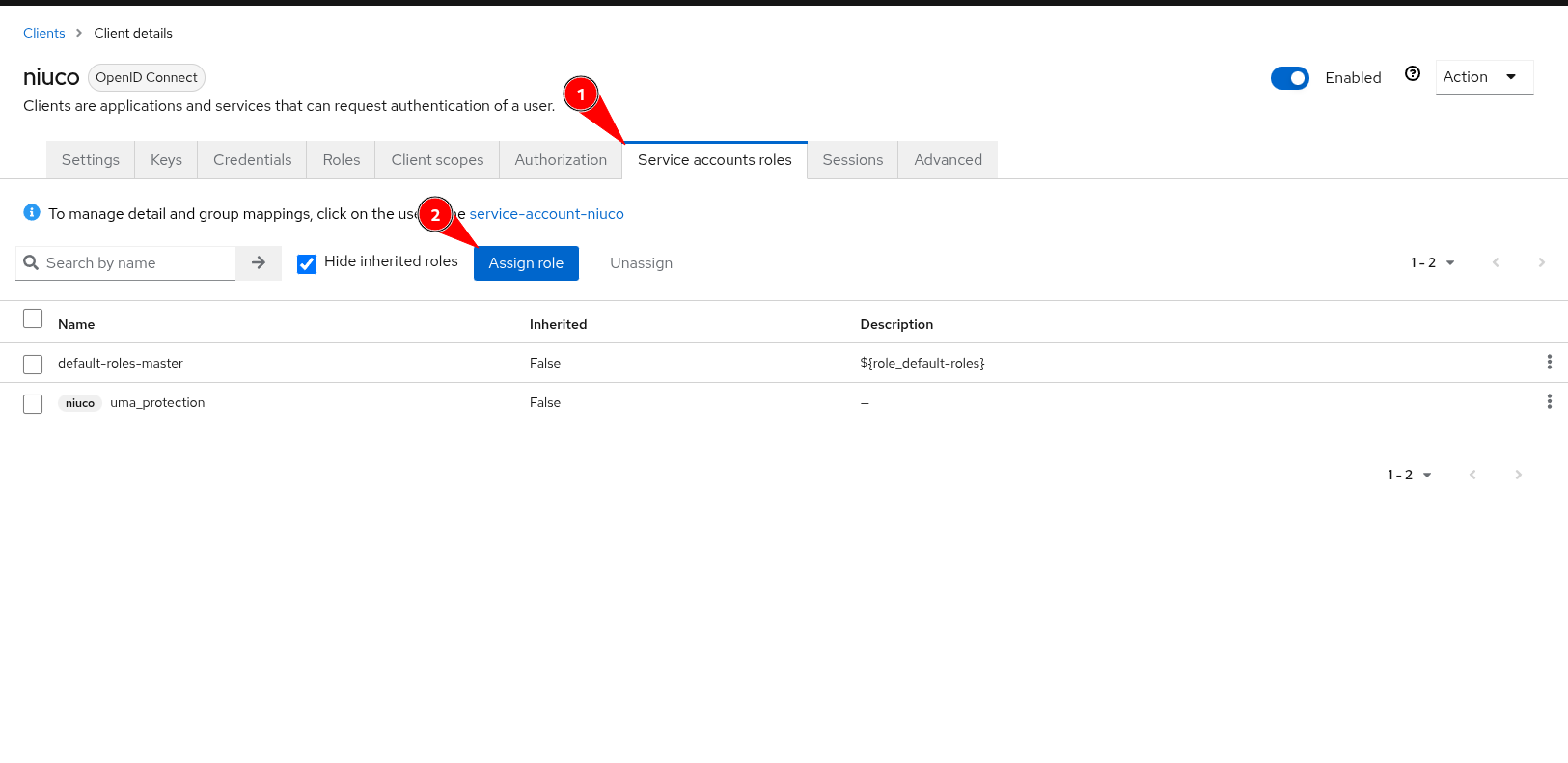 1 - No detalhe do client criado na etapa acima, clique em "Service accounts roles" e depois clique em "Assign role"