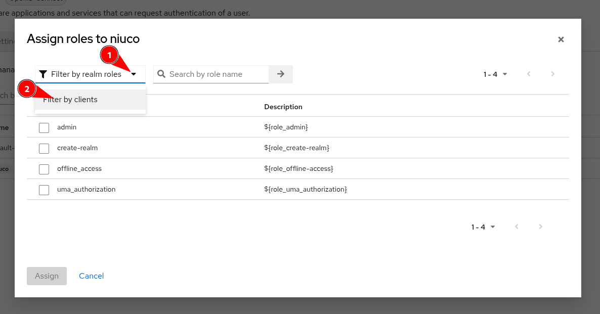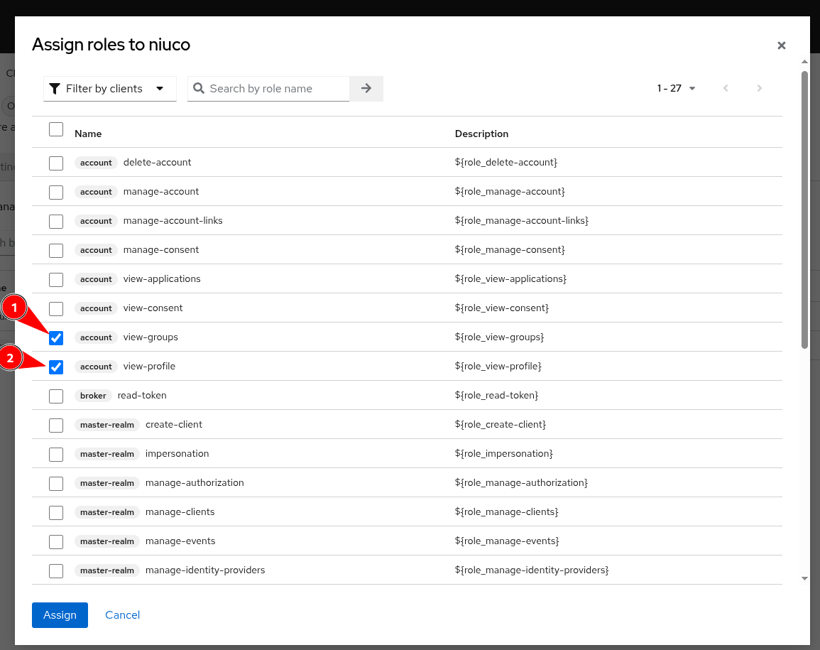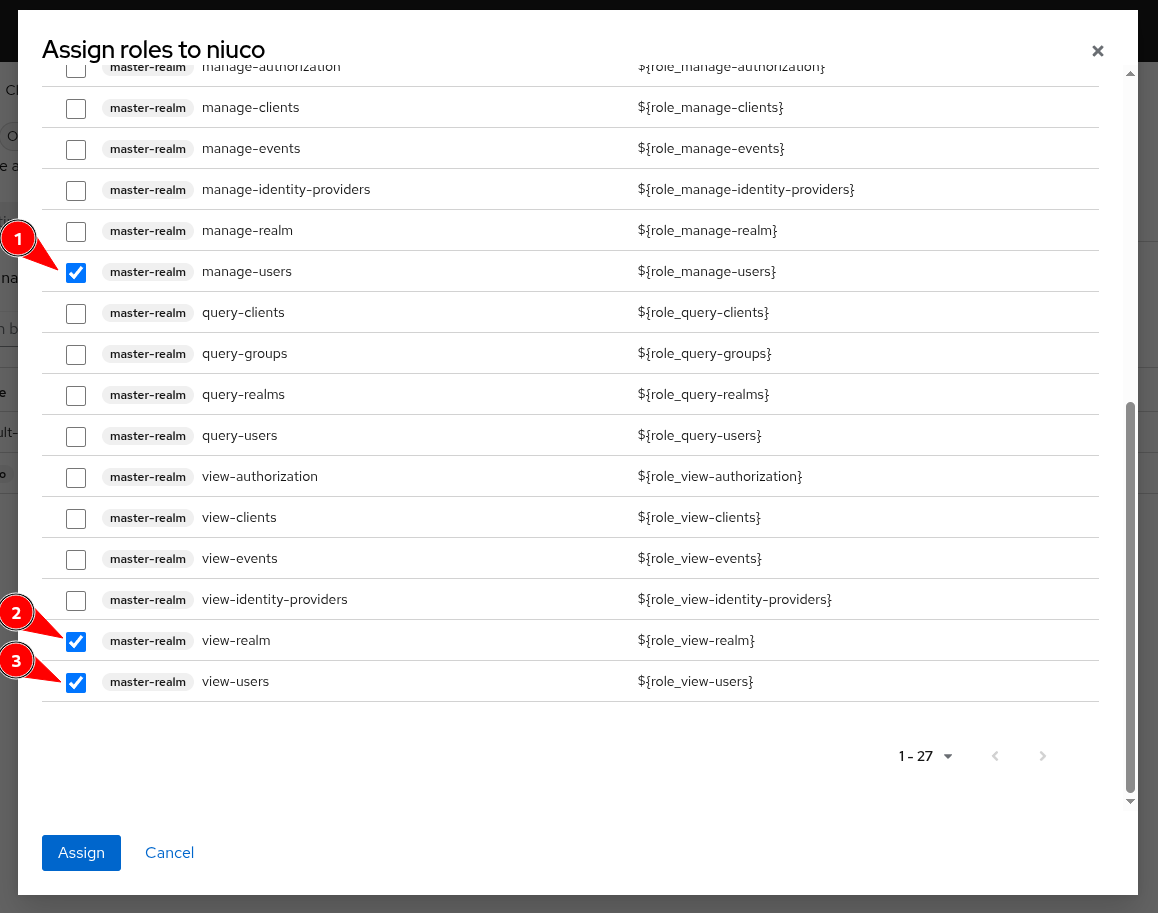 8 - Selecione "manage-users", "view-realm" e "view-users". Clique em "Assign"
