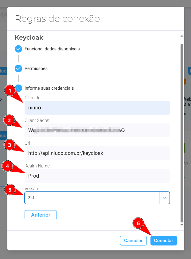 3 - Após informar cada um dos campos "Client Id", "Client Secret", "URL", "Realm Name" e "Versão". Clique em "Conectar"