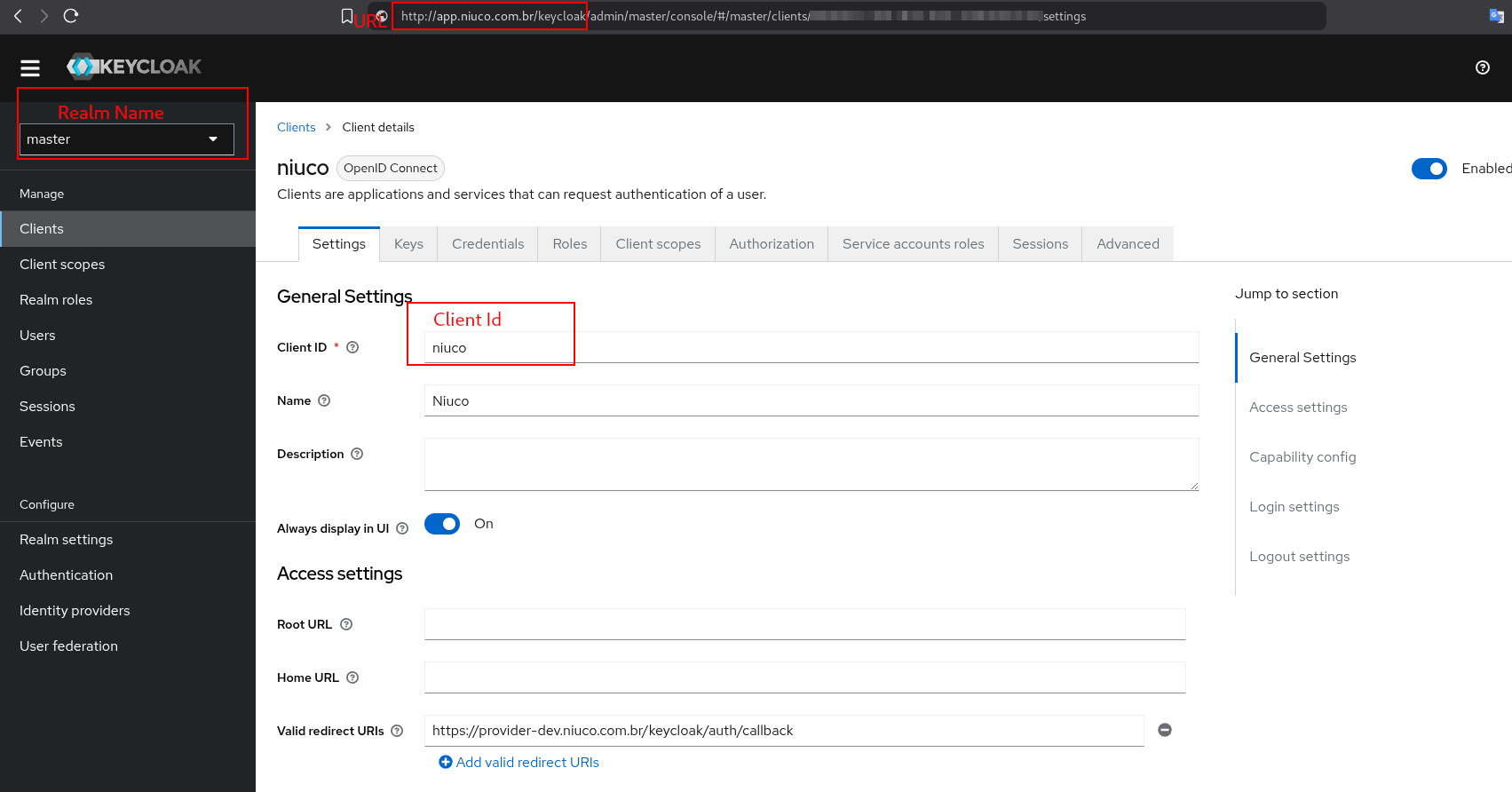 Já dermos as permissões necessárias para o funcionamento da integração Niuco!Conexão Keycloak na Niuco