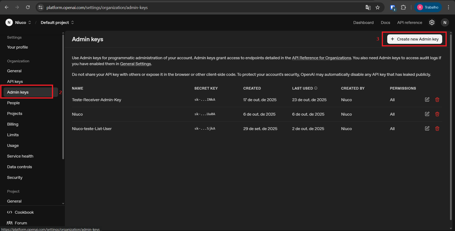 Após efetuar o login na plataforma OpenAi, clique no ícone de engrenagem no canto superior direito (1) e logo em seguida, na nova tela que será exibida, selecione a opção Admin keys (2), na coluna lateral esquerda e clique no botão + Create new Admin Key (3).