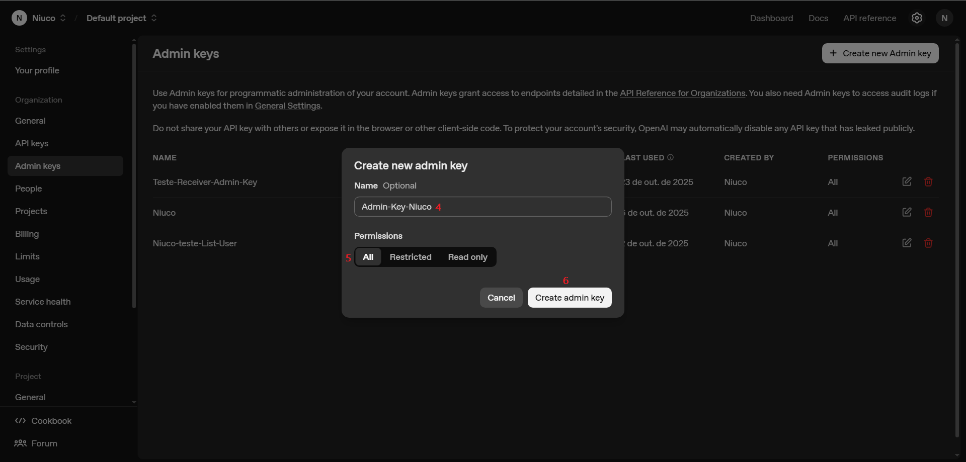 Na pequena tela que será exibida, dê um nome à sua escolha para a sua nova Admin Key(4), mantenha Permissions como All (5) e clique no botão Create Admin Key (6).