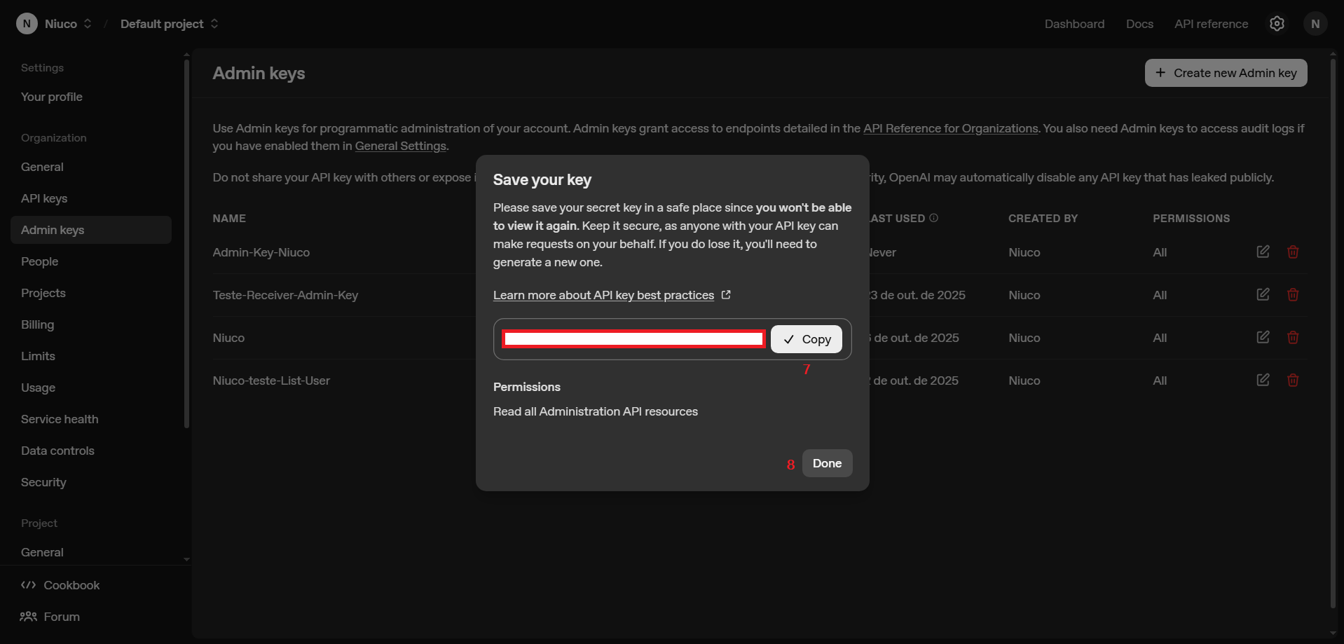 Agora, clique em Copy (7) para copiar a Admin Key e cole o valor em um arquivo provisório, como um .txt qualquer, pois iremos usá-la posteriormente. Tendo feito isso, clique em Done (8).