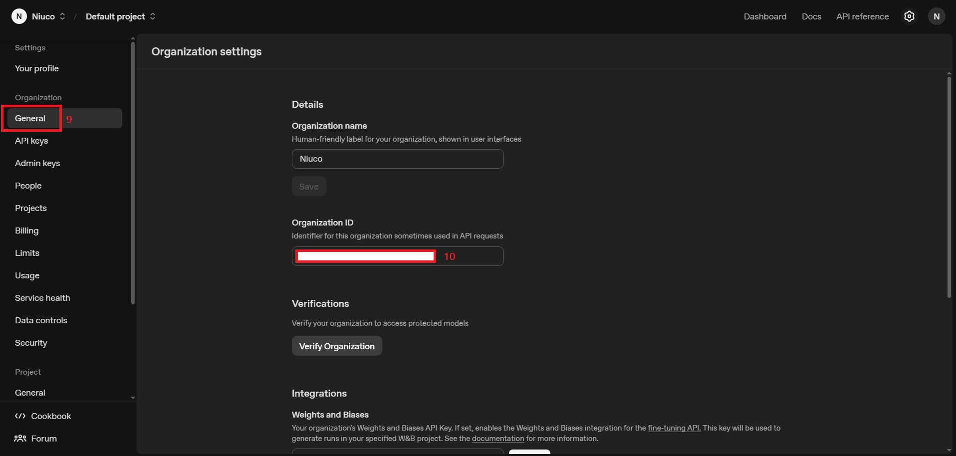 Agora que já temos a Admin Key reservada para a conexão, precisamos também capturar o Organization ID. Para isso, selecione a opção General no menu da coluna lateral esquerda (9). Com isso, será exibido o Organization ID (10). Copie o valor e cole em um arquivo, assim como fez com a Admin Key.