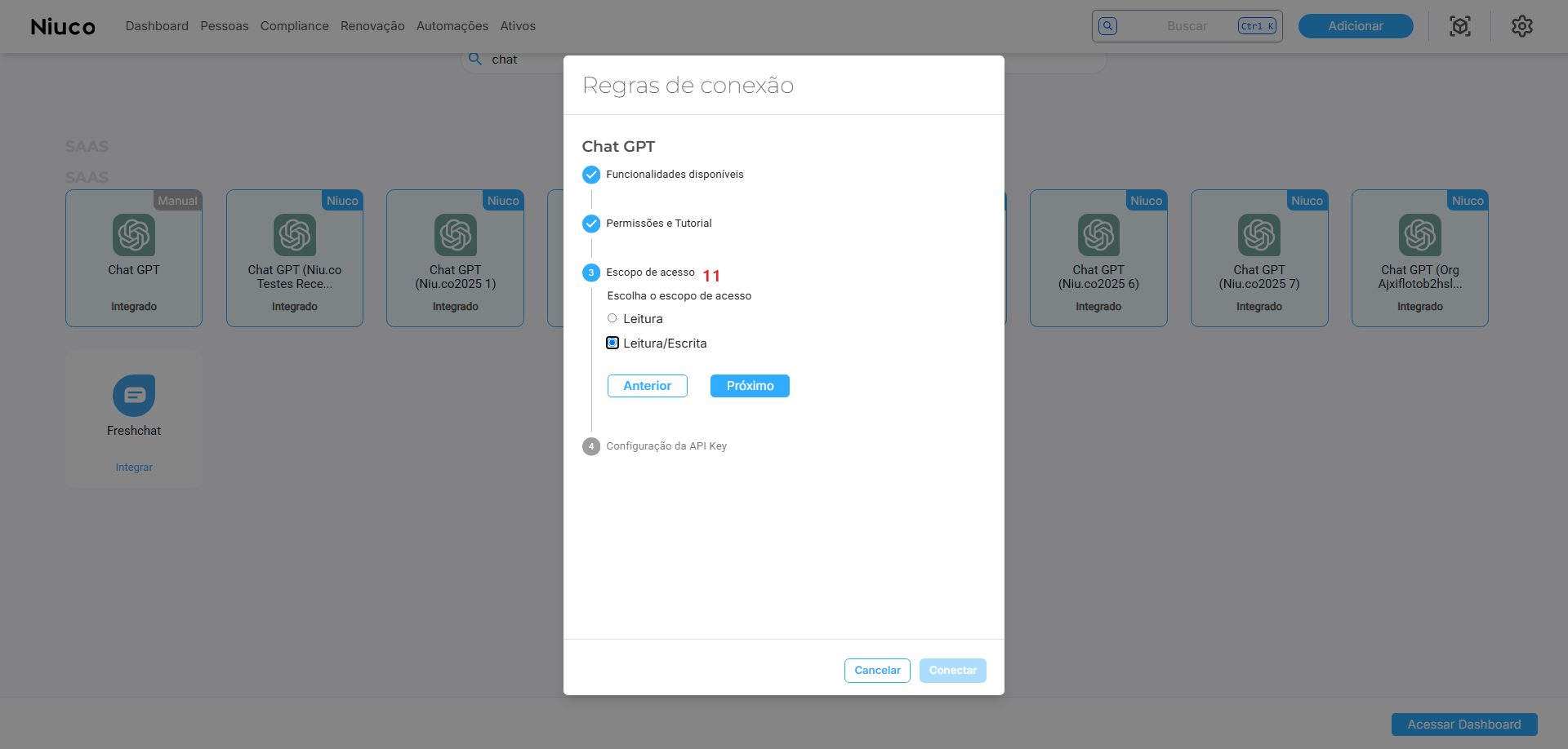 Na plataforma da Niuco, na tela das regras de conexão com o fornecedor Open AI, avance até o passo Escopo de Acesso (11), ali selecione apenas Leitura ou Leitura/Escrita para acesso a recursos como criação, atualização e remoção de usuários. Após isso, clique em Próximo para avançar para a última etapa.