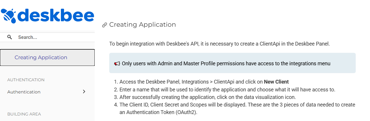 Para conectar a Niuco ao Deskbee são necessários o Client Id e o Client Secret. Para isso, você precisará primeiramente criar um ClientApi no painel da Deskbee. É só seguir as instruções da própria documentação fornecida pela plataforma em https://api.deskbee.io/#section/Introduction/Creating-Application, conforme pode observar na imagem abaixo: