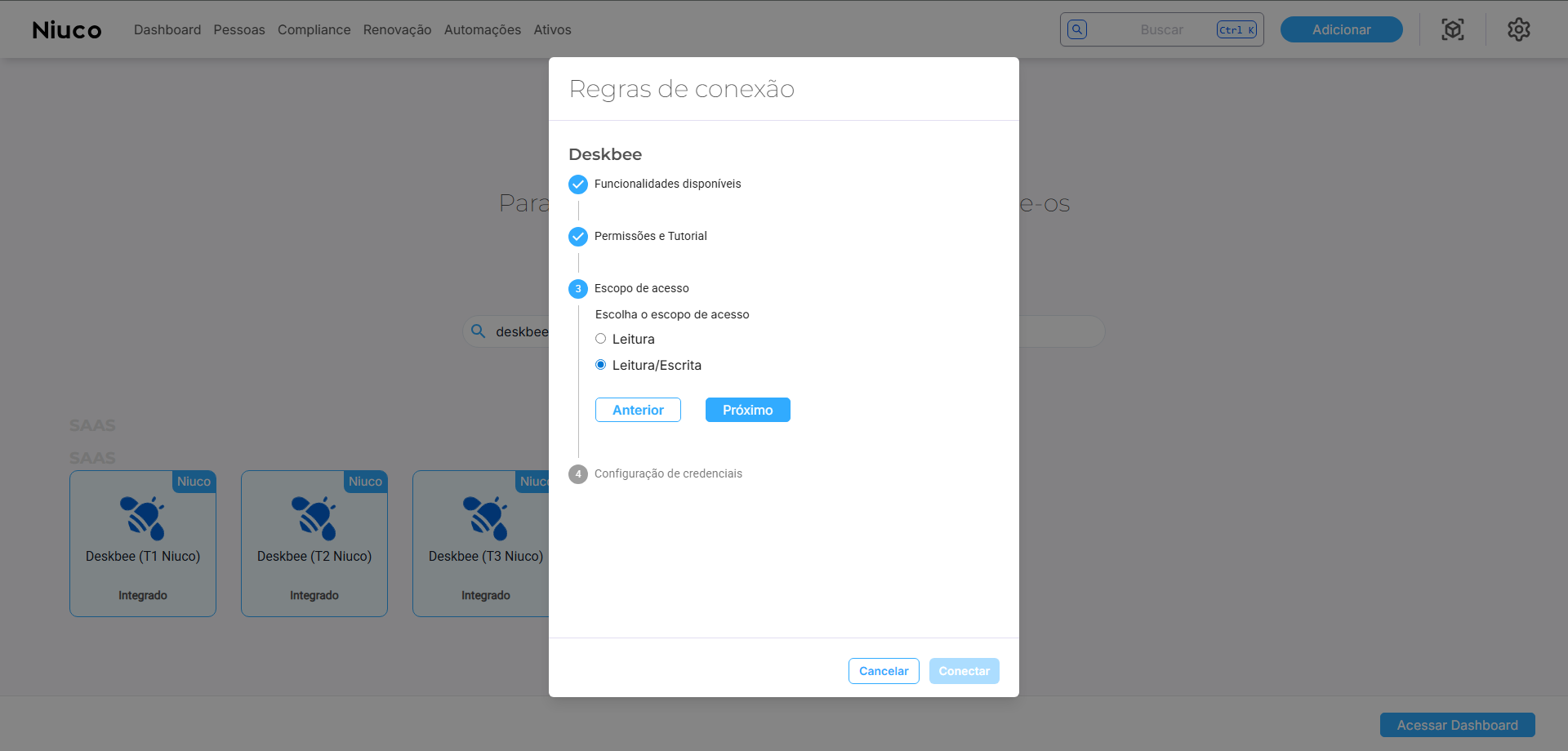 Na plataforma da Niuco, na tela das regras de conexão com o fornecedor Deskbee, avance até o passo Escopo de acesso, ali selecione apenas Leitura ou Leitura/Escrita para ter acesso a recursos avançados como criação, atualização e remoção de usuários. Depois, clique em Próximo para avançar para a etapa de Configuração das credenciais.