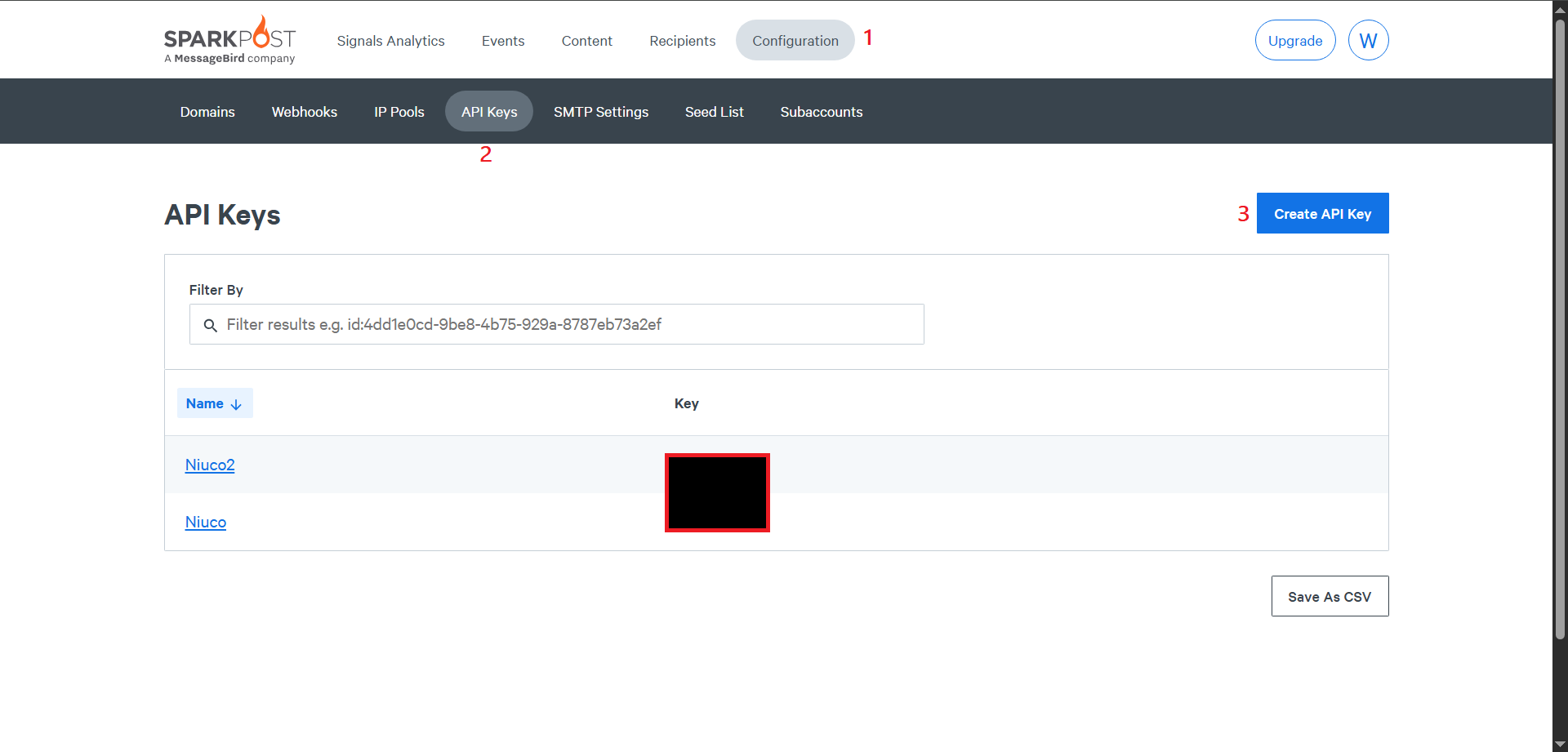 Assim que estiver na dashboard do Sparkpost, clique em Configuration (1). Depois, no menu da tela que irá ser exibida, selecione API Keys (2) e Create API Key (3).