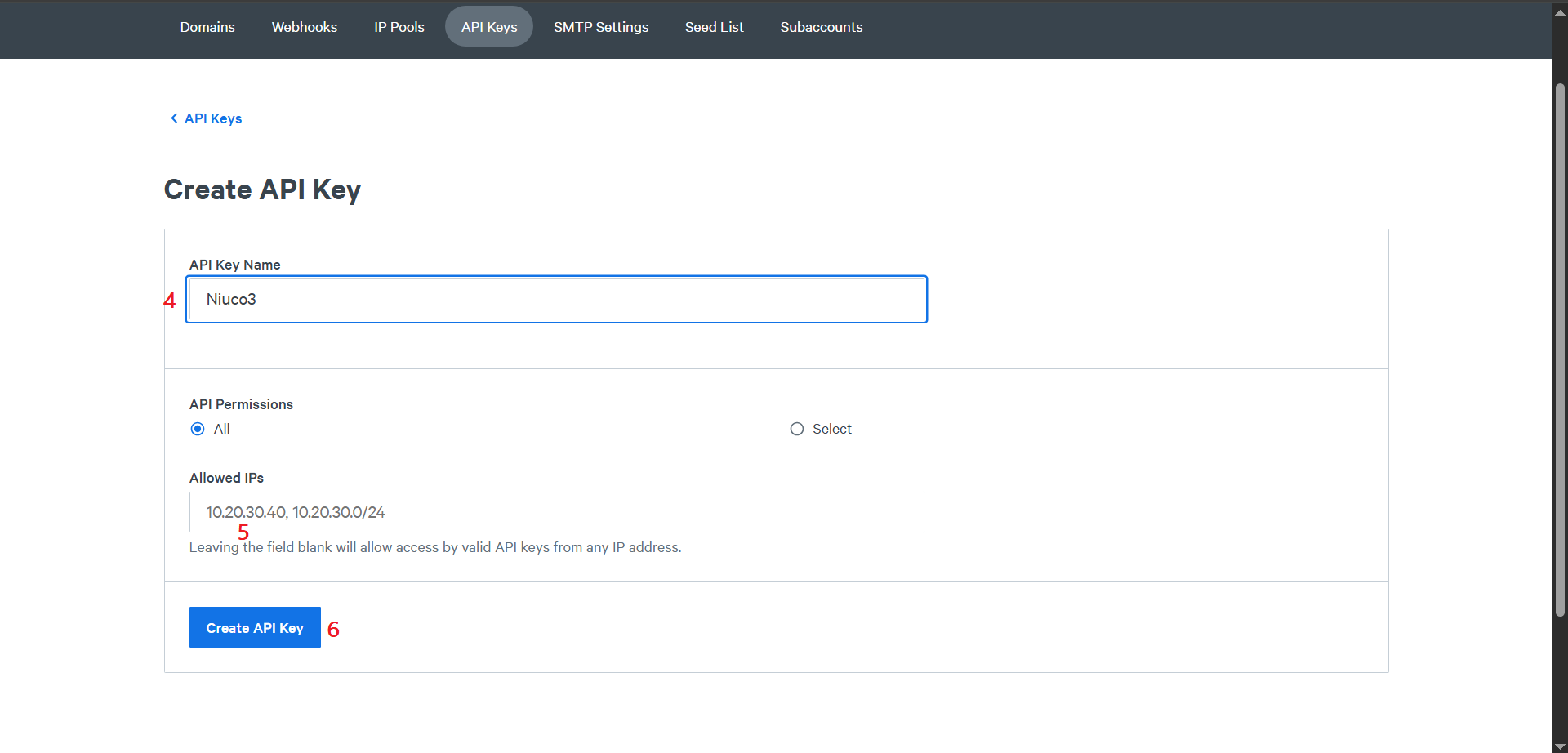 No campo API Permissions garanta que esteja selecionado All (5) e clique em Create API Key (6).