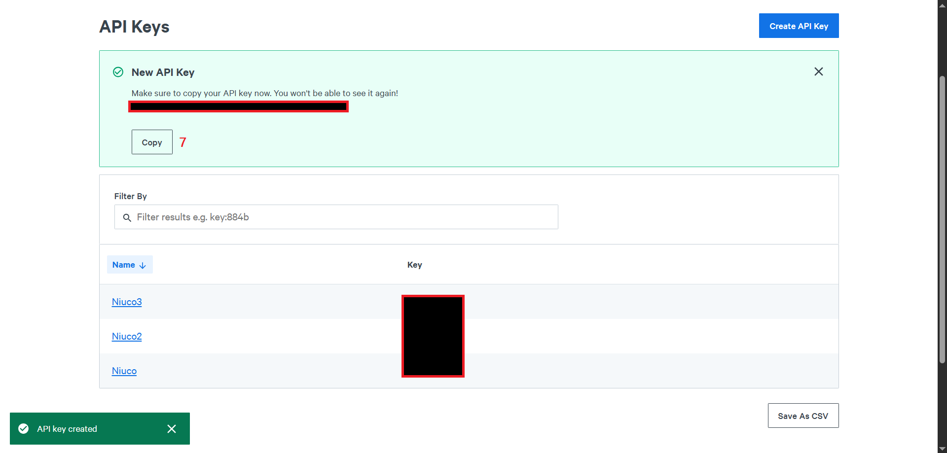 Em seguinda, você já conseguirá visualizar a nova API Key. Clique em Copy (7) e cole o valor em um arquivo provisório, um .txt qualquer.