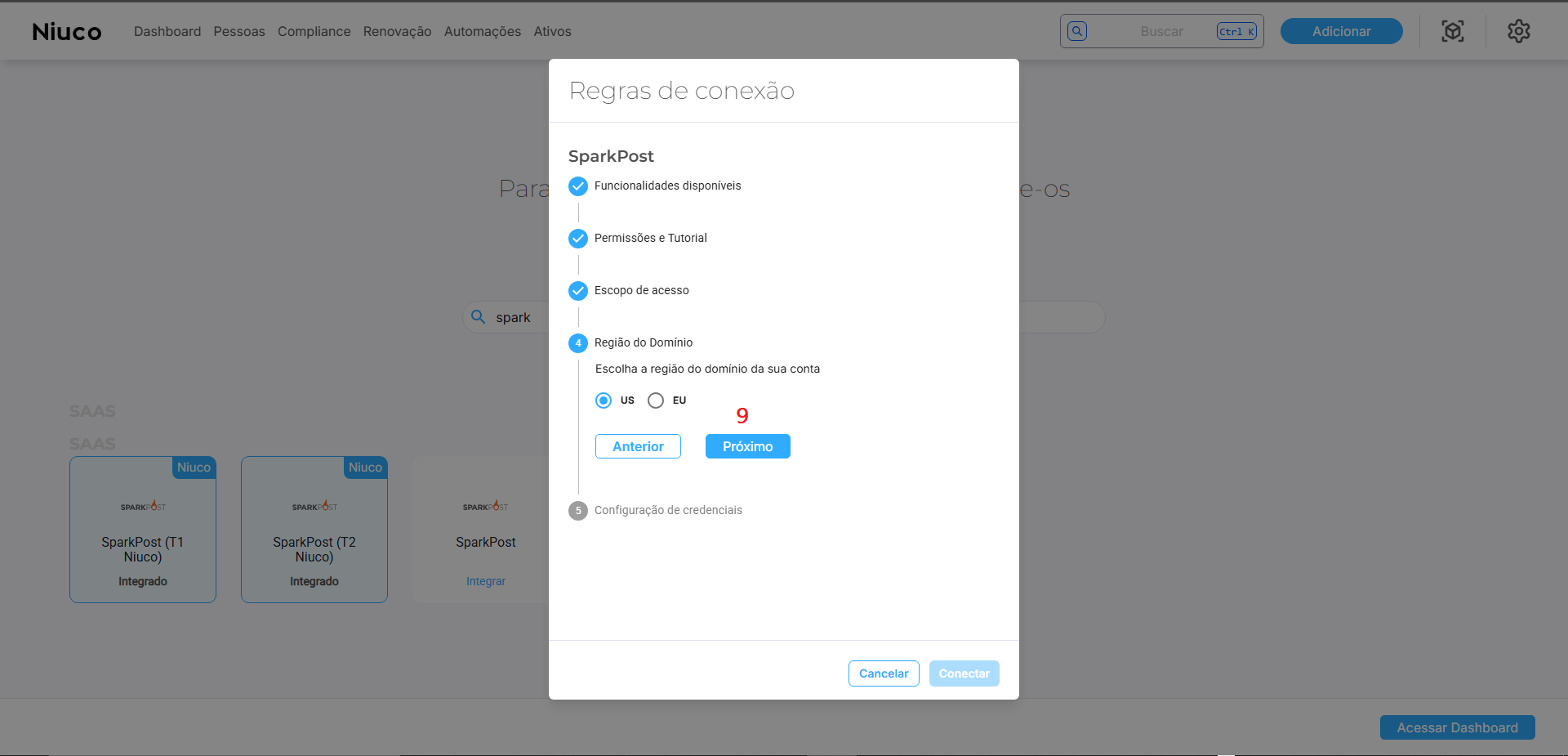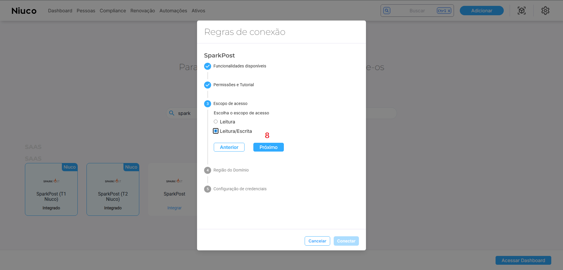 Na plataforma da Niuco, na tela das regras de conexão com o fornecedor Sparkpost, avance até o passo Escopo de acesso (8), ali selecione apenas Leitura ou Leitura/Escrita para garantir que futuramente terá acesso a recursos avançados como remoção ou criação de usuários, assim que isso estiver devidamente implementado e/ou a API possibilitar. Depois, clique em Próximo para avançar para a etapa de Região do Domínio.
